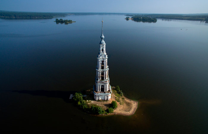 Главным символом и украшением Калязина является уникальная колокольня Никольского собора, построенная в 1800 году. Она представляет собой удивительное зрелище — величественное сооружение словно вырастает прямо из водной глади на небольшом острове. История колокольни тесно связана с созданием Угличского водохранилища в 1939 году, когда основной собор был разобран, а первый ярус колокольни оказался частично под водой. В последующие десятилетия она выполняла важную функцию навигационного маяка, помогая судам безопасно проходить этот участок водного пути.