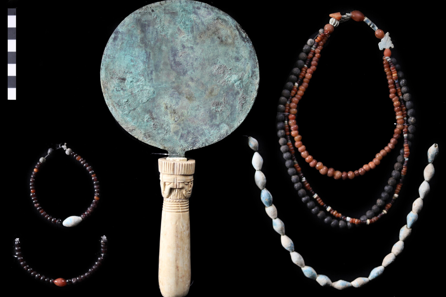 Археологический комплекс включает 11 sealed погребений, принадлежащих представителям разных возрастов и полов. Несмотря на то, что часть деревянных саркофагов и льняных покровов пострадала от древних наводнений, многие артефакты сохранились в превосходном состоянии. Среди найденных сокровищ особенно впечатляют изысканные амулеты, перстни со скарабеями, декоративные пояса и элегантные браслеты из бусин. Особого внимания заслуживают два медных зеркала с изящными рукоятками из слоновой кости. Примечательной находкой стало также редкое ожерелье из белого фаянса с подвеской в форме головы бегемота, обнаруженное в мужском захоронении.