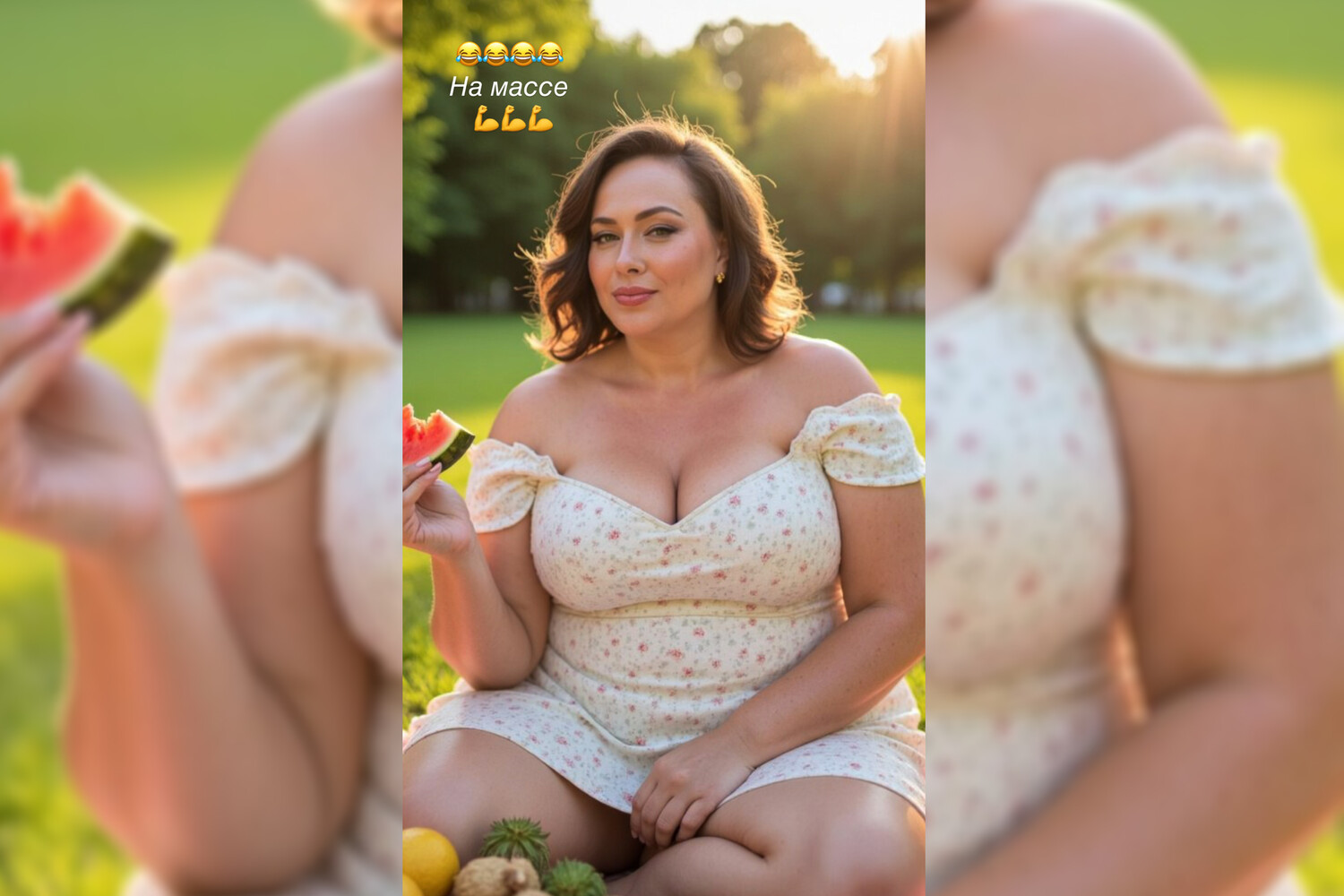 Артистка предстала в роскошном светлом платье, украшенном изящным цветочным узором. Наряд подчеркивал открытые плечи и декольте, гармонично дополняя образ. Элегантная укладка волос средней длины придавала look’у особый шарм. На снимке Настасья расположилась на зеленой лужайке, держа в руках сочный кусочек летнего арбуза.