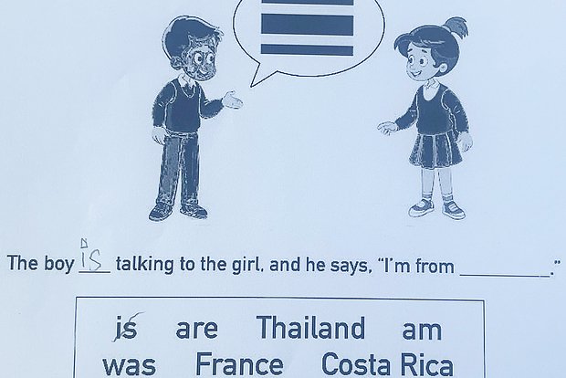 Оригинальное задание представляет собой увлекательный диалог двух персонажей — мальчика и девочки. В ходе их общения юный собеседник рассказывает о своей родной стране. Вместо текстового ответа в учебном материале размещено изображение государственного флага, состоящего из пяти чередующихся полос — трех темных и двух светлых. Ученикам предстоит определить, какую страну представляет данный символ.