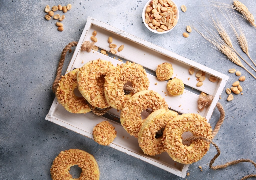 Присыпьте рабочую поверхность мукой и раскатайте охлажденное тесто в пласт толщиной 6-7 миллиметров. При помощи специальных форм или обычной крышки создайте очаровательные кольца. Отделите желток от белка, взбейте его и нанесите на поверхность каждого печенья. Украсьте заготовки обжаренным арахисом.
