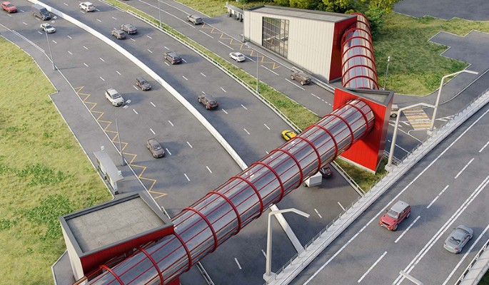 Конструкция в форме прозрачного тоннеля с поперечными кольцами обеспечит естественное освещение в дневное время. Ночью же включится современная система подсветки, превращающая переход в своеобразный арт-объект. Скошенные крыши и панорамное остекление добавят сооружению легкости и воздушности.