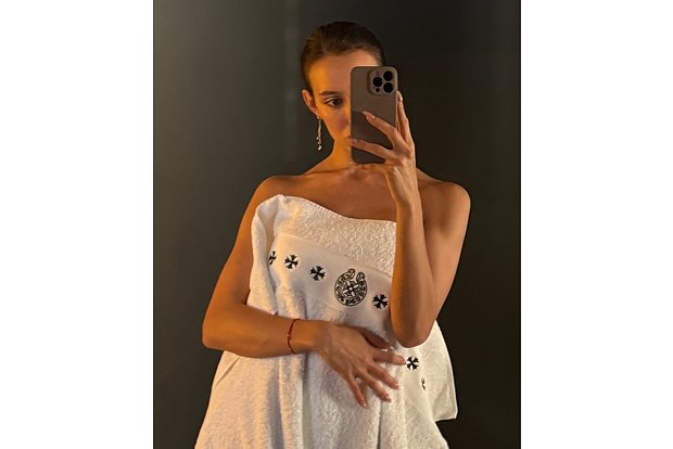 Девушка продемонстрировала утончённый лук: белое полотенце с графичным чёрным принтом, обёрнутое вокруг тела, гладкий высокий хвост и изящные серьги-цепочки. Нюдовый маникюр завершил элегантный образ. «Антицеллюлитный скраб и ледяной душ — мой must-have», — поделилась Валентина в подписи к фото, подчеркнув внимание к деталям ухода за собой.