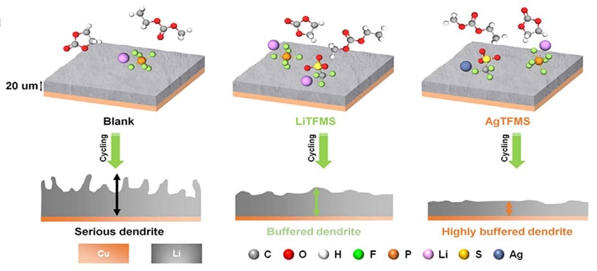 Главным препятствием остаются дендриты — кристаллические образования, которые повреждают структуру аккумулятора. Они провоцируют замыкания, сокращают срок службы и создают риски возгорания. Учёные из Южной Кореи нашли способ борьбы с этой проблемой, добавив в электролит трифторметансульфонат серебра (AgCF₃SO₃).