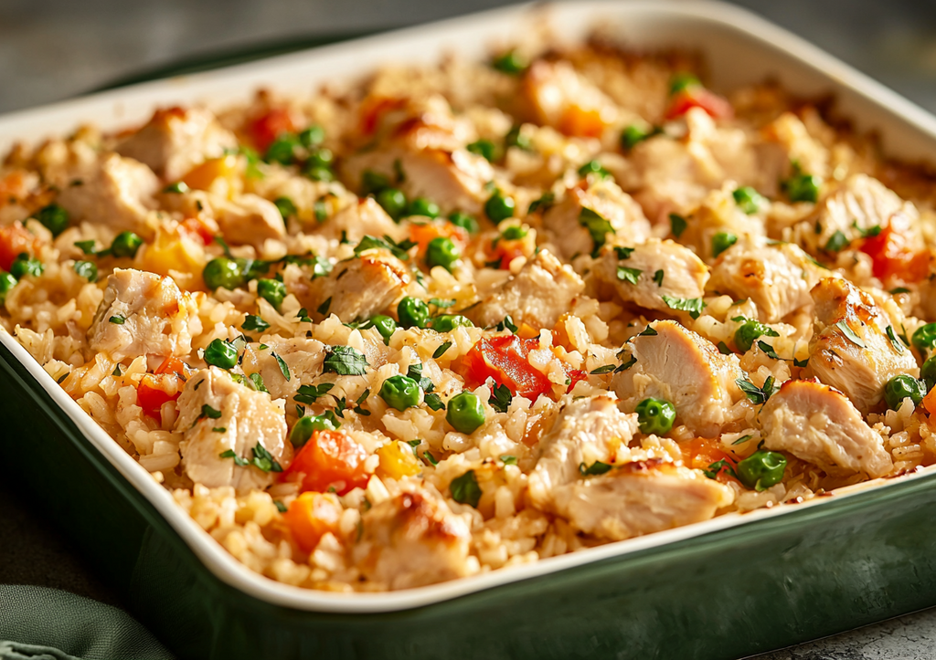 Выложите курицу с овощами в форму, сверху распределите рисовую массу и посыпьте 150 г тертого сыра. Отправьте в духовку при 180°C на 25–30 минут — сырная корочка должна стать янтарной. Перед подачей украсьте блюдо свежей зеленью, а на стол поставьте сметану или нарезку из сезонных овощей.