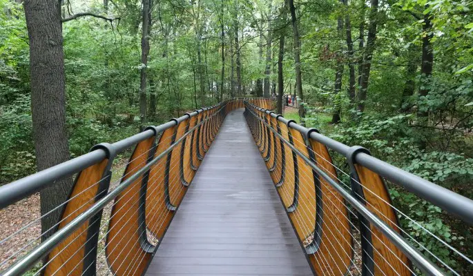 При проектировании площадки особое внимание уделили заботе об окружающей среде. Чтобы сохранить здоровье почвы и обеспечить устойчивость конструкции, специалисты установили около 200 свай, не нарушая естественный ландшафт заказника. Для комфорта всех посетителей, независимо от возраста, были смонтированы перила с деревянными накладками разной высоты, что делает зону доступной и безопасной.