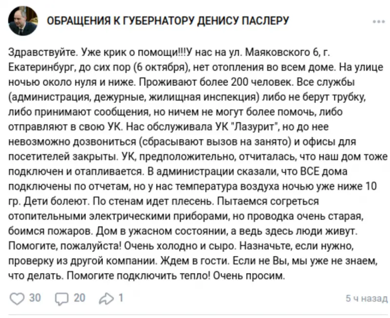 Жители девятиэтажного дома в Екатеринбурге, находящегося под управлением УК «Лазурит», сообщают об отсутствии отопления в своих квартирах. Обращение с просьбой о помощи было направлено губернатору Свердловской области.