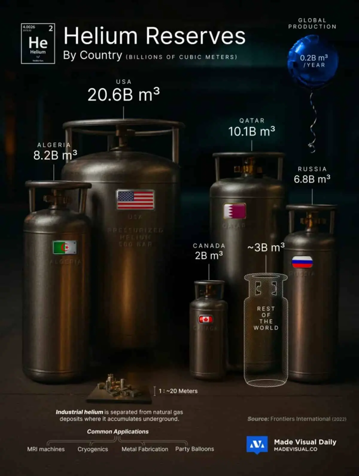 Россия, занимающая четвертое место, имеет 6,8 миллиарда кубических метров гелия. Благодаря развитию новых газовых месторождений потенциал страны в этой сфере с каждым годом увеличивается, открывая перспективы для еще большего вклада в мировой рынок. Канада также присутствует в числе заметных производителей с запасами около 2 миллиардов кубических метров, а в Китае этот показатель составляет около 1,1 миллиарда кубометров.