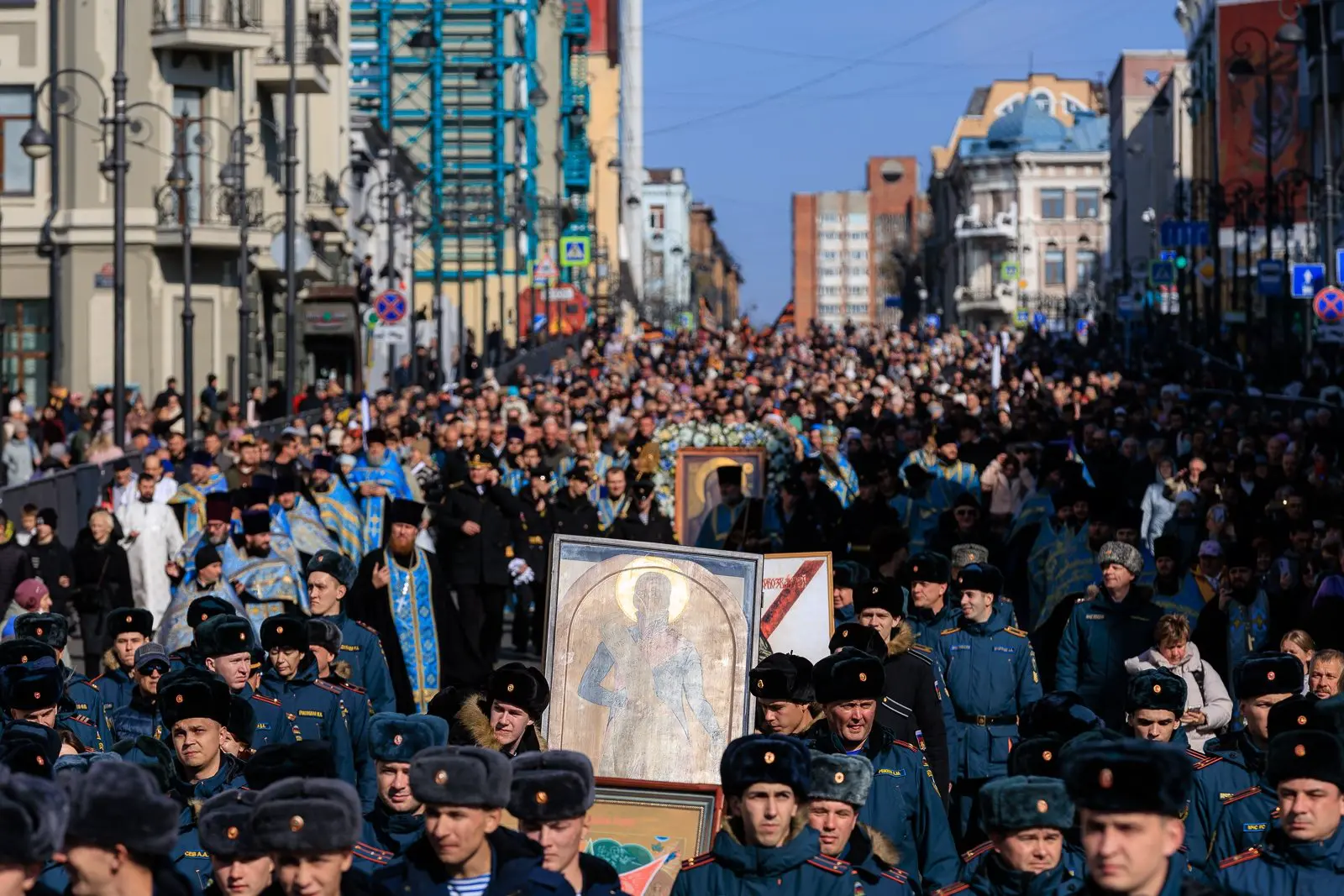 День народного единства и светлый праздник Казанской иконы Божией Матери во Владивостоке ознаменовались масштабным крестным ходом, объединившим тысячи горожан. По благословению митрополита Владивостокского и Приморского Павла праздничное шествие собрало жителей всех возрастов и профессий: к колонне присоединились представители общественных, казачьих, молодежных и военных организаций, учащиеся и многочисленные семьи с детьми. Наравне с горожанами в мероприятии приняли участие губернатор Приморского края Олег Кожемяко и глава администрации Владивостока Константин Шестаков.