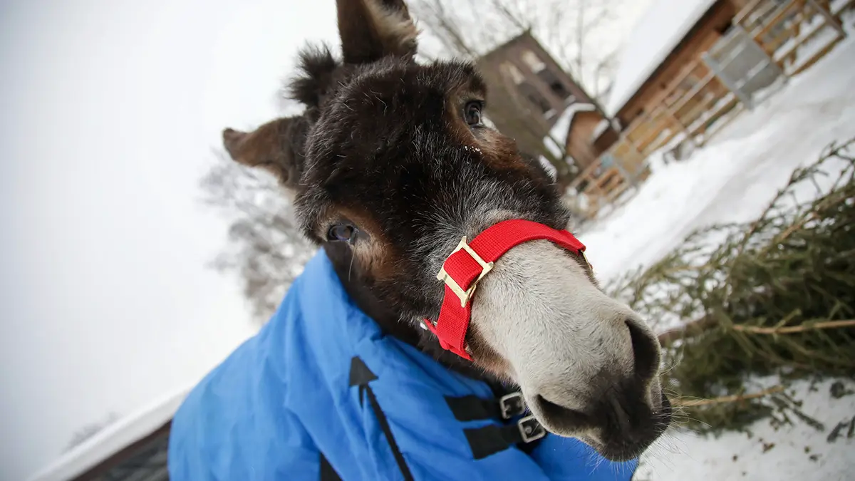 Жорик обжился на новой территории в детском зоопарке. Столичные морозы ему не страшны — ослик полностью адаптировался к зимним условиям. Его день строго расписан: активные прогулки занимают первую половину дня, а остальное время он проводит в комфортном вольере.