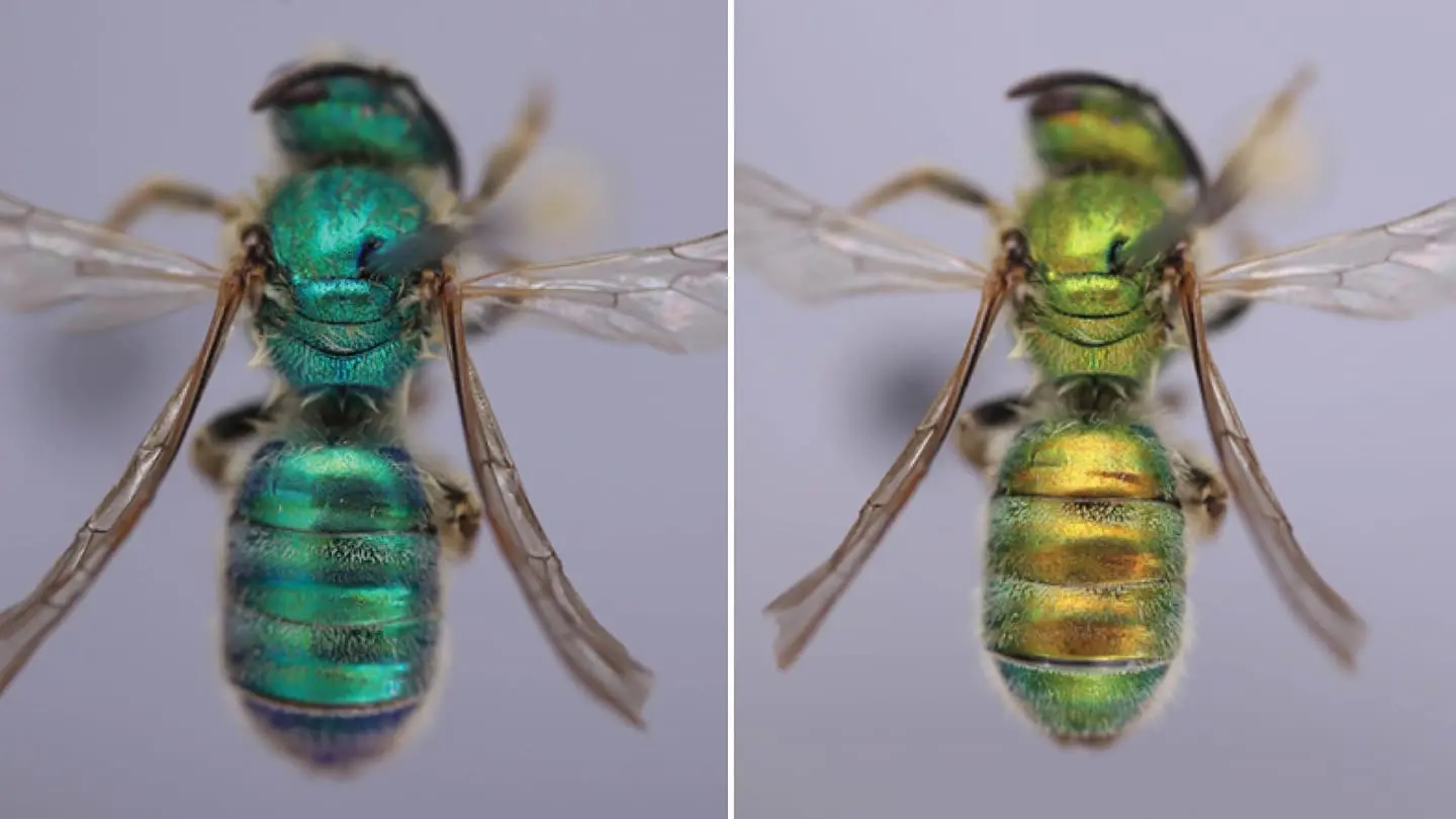 Полученные результаты поразили исследователей своим масштабом. При высокой влажности металлический зеленый окрас пчелы становился теплее, приобретая заметный оранжево-зеленый оттенок. Если же влажность снижалась, преимущество переходило к синим и голубым оттенкам: пчела выглядела прохладно-голубой, словно оправданно носила прозрачную дымку утреннего неба. Самые сильные изменения происходили в первые сутки, а затем цвет стабилизировался. Особенно выражено реагировали старые музейные экземпляры — со временем их кутикула становится более пористой, а значит и чувствительной к воздействию влаги.